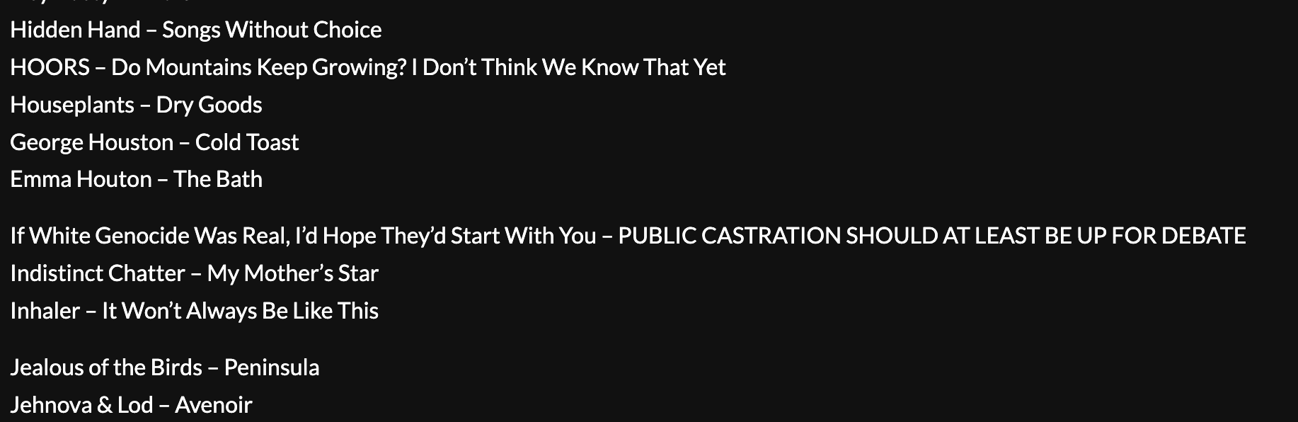 Spotify's an enemy and I finally cut ties last month. I had been talking about this for about a year and investigating other options. Eventually I just jumped ship when they threw that party for Ben Shapiro after Trump's inauguration. I use Qobuz now. I like Qobuz. They actually write about music! They seem to pay a less-terrible royalty rate (the Benn Jordan video I posted above seems to imply they pay more than a fraction of a penny)! I saw a Tony Bontana album in their monthly roundup and I wondered if I'd ever see the likes of that from Spotify. Not after they laid off hundreds and committed to being a slop factory anyway, that's for sure.