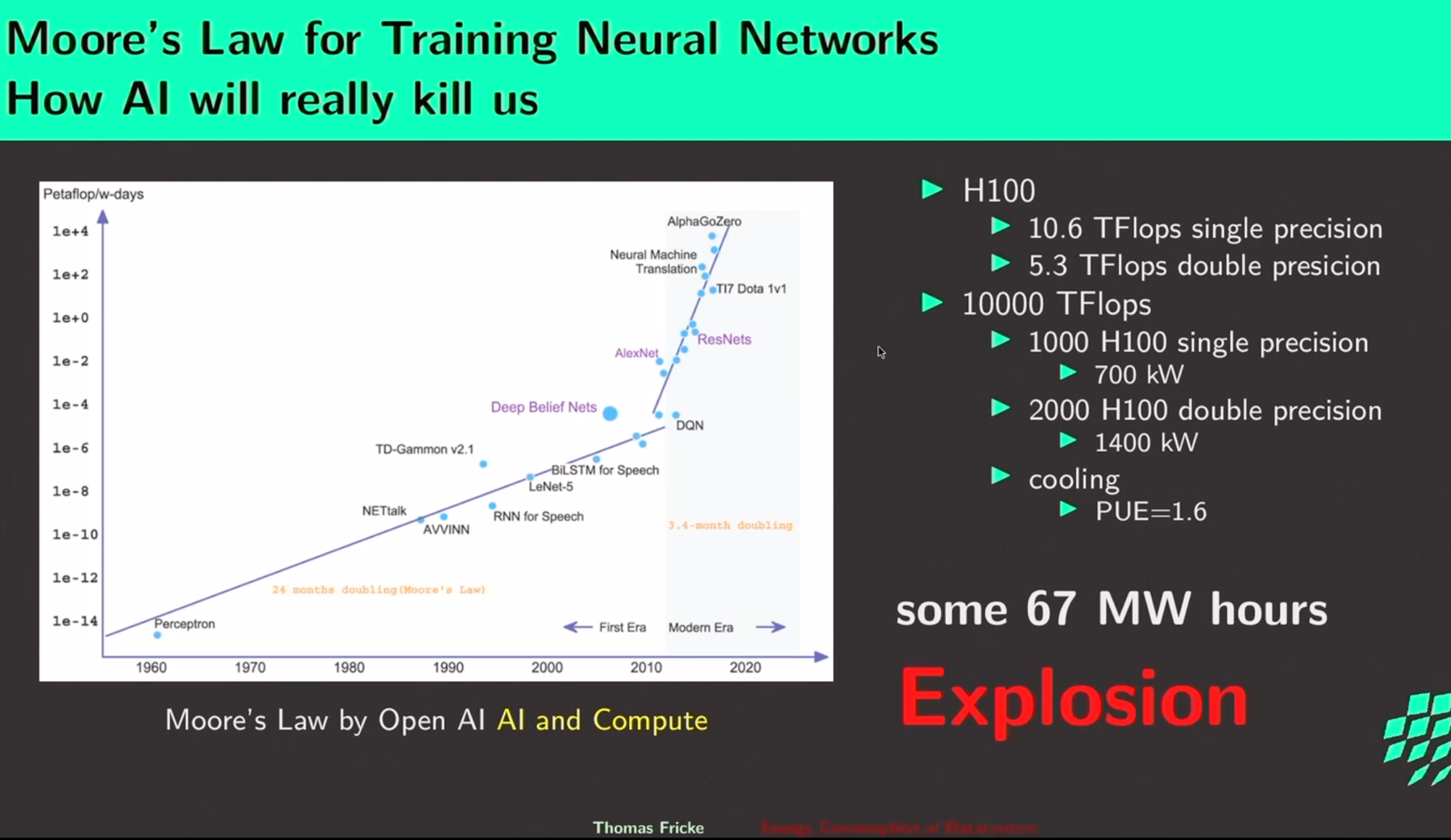 A thought that hadn't crossed my mind at all when I wrote the talk was the environmental cost of training AI models, in part because back then, the models we were discussing were tiny, often trained within hours on a single GPU or in a free Google notebook. That isn't the case anymore. I went to a talk at SRECon simply titled "Energy Consumption of Datacentres". The slides in that one look, uh... Scary.
